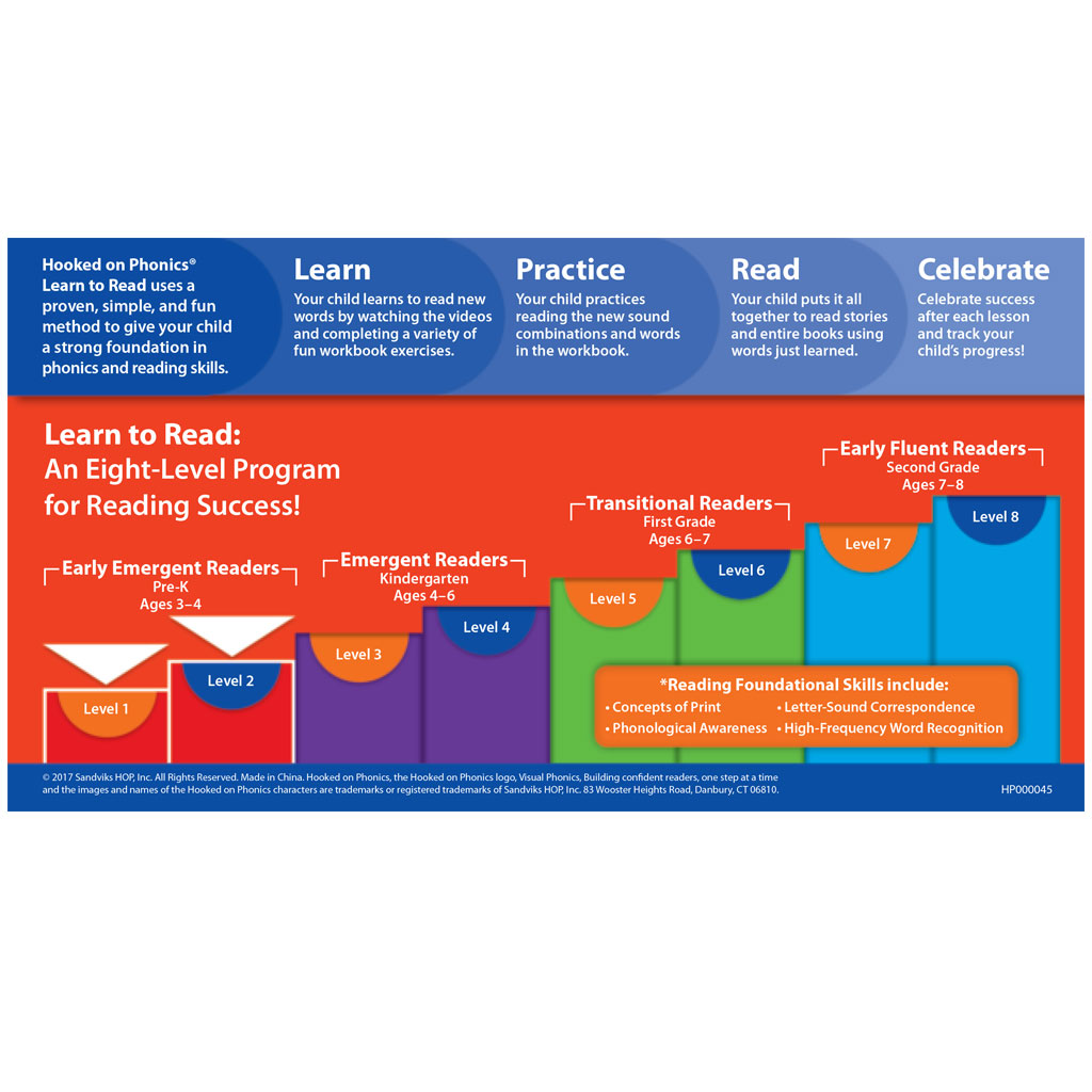 Hooked on Phonics® Learn to Read 키트에는 Pre-Kindergarten부터 Second Grade까지 8단계의 프로그램이 있습니다.